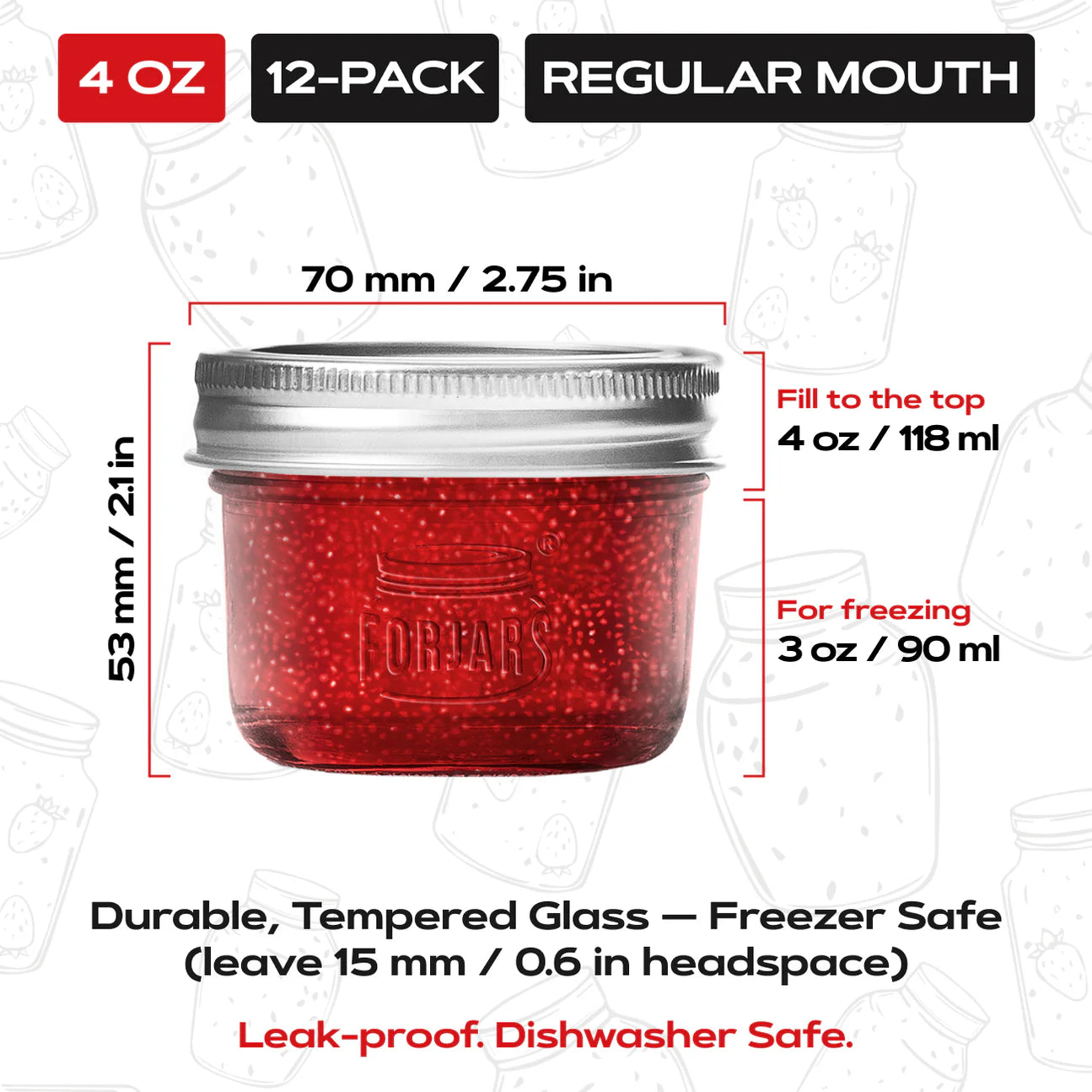 FORJARS® - FORJARS® Premium Mason Jars – 4 oz (12-Pack) | Regular Mouth Glass Canning Jars